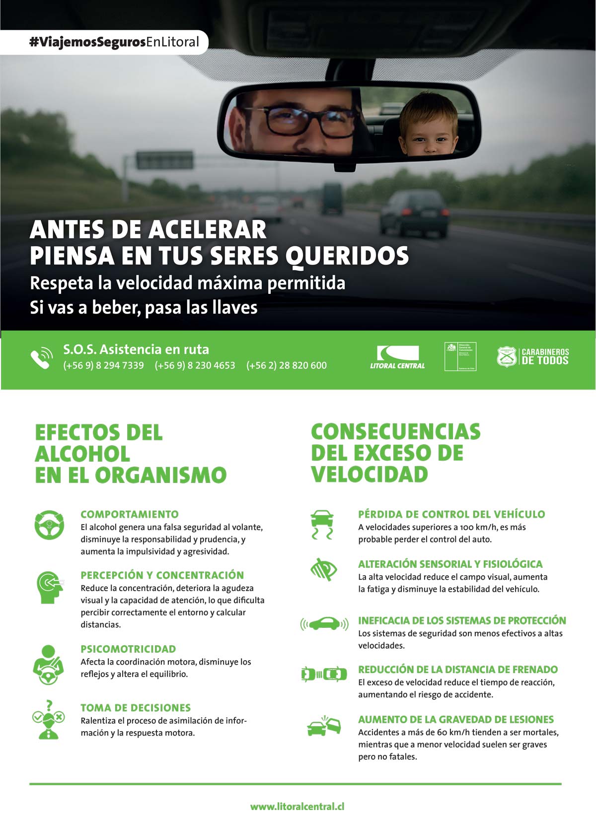 Con una campaña de difusión que llama a los conductores a no conducir bajo la influencia del alcohol y respetar los límites de velocidad, las autoridades de la zona se dieron cita en la plaza de peaje Troncal para entregar información a los conductores con mensajes a la prevención e informar los números de emergencia en ruta. Esta campaña se extenderá por toda la semana de Fiestas Patrias y el principal llamado es a la conducción responsable.